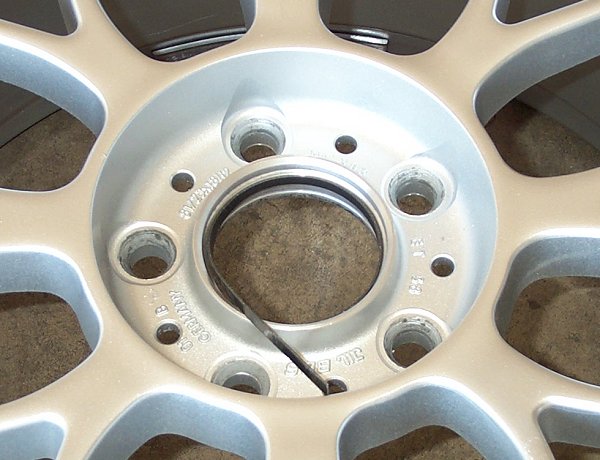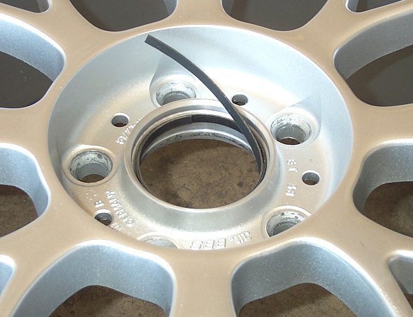 BMW Roundel logo center caps from factory BMW wheels where used in the center hole of the BBS RC wheels to give them a custom and unique look by leaving the lug bolts exposed. The BMW center caps are 4mm smaller in diameter than the BBS RC center holes, so spacer ring inserts had to be made from sound deadening material with adheasive backing (i.e. - Dynamat Original) to take up the extra space and give the center caps a lip to snap into.