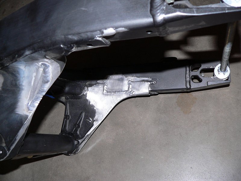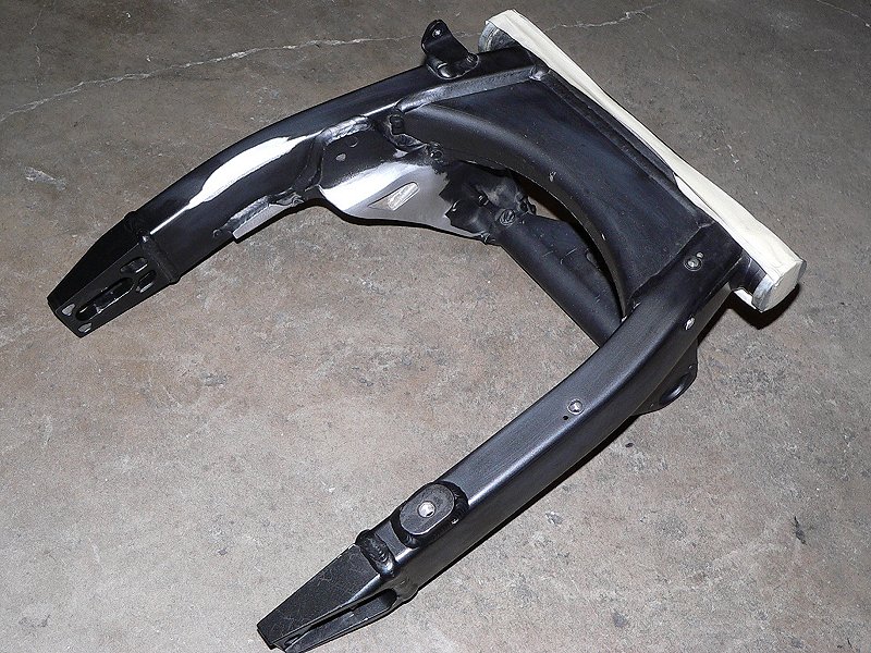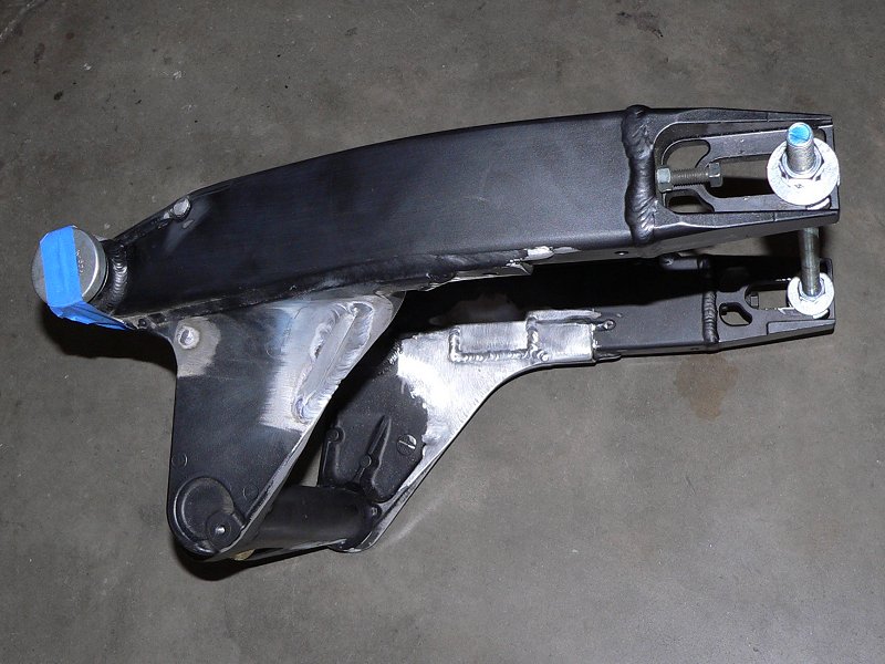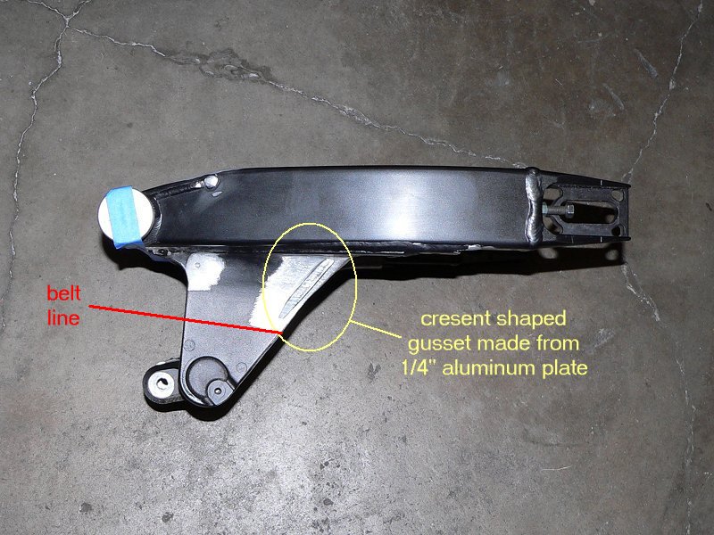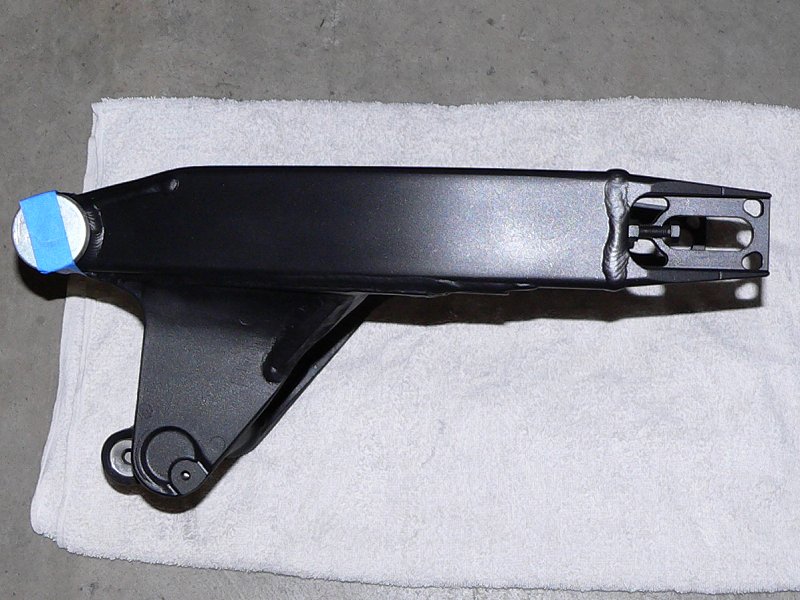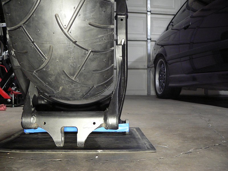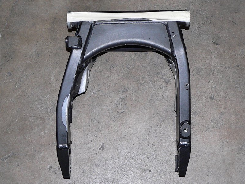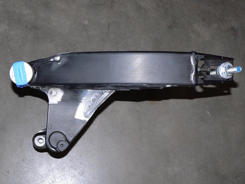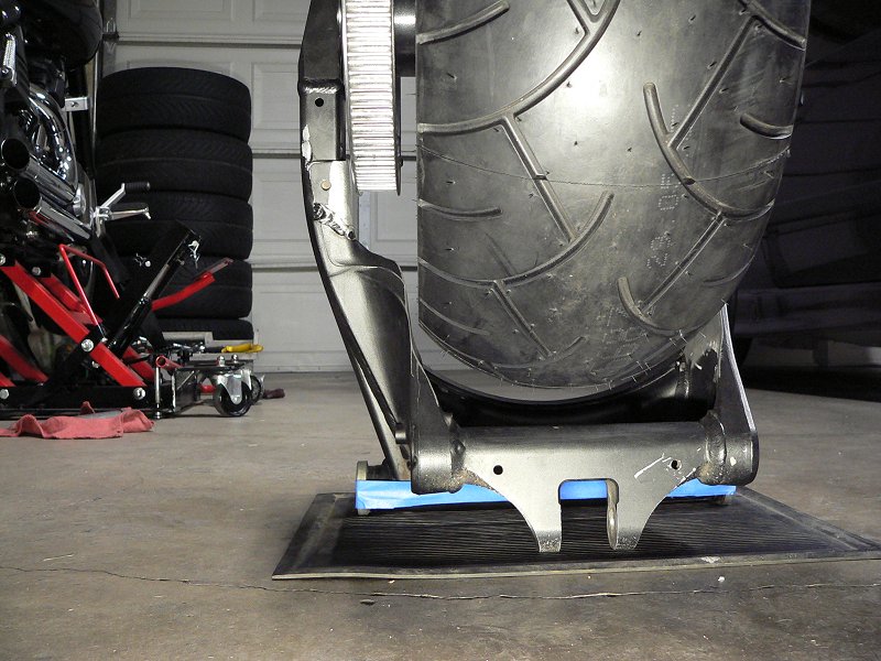 My plan for this '05/'06 winter project is to: Other non-240 items to do during the winter project: 11/22/2005 Put the bike up on the jack and strapped it down. Marked off the areas on the inside of the swingarm where I'll need to remove material to fit the wider wheel and tire. Then I removed the rear brake caliper, brake caliper bracket, and rear wheel and tire. 11/23/2005 Disassembled the throttle-side switch housing to remove the ignition kill switch to paint it flat black. While the switch housing was disassembled I also decided to re-paint throttle cable elbows black (the elbows were scratched and the factory color is that dark army green). I was also able to cut out the indentation in the rear brake caliper bracket. ![]() 11/25/2005 Cut the belt guard mounting tabs off the swing arm and smoothed down those areas. I also removed the rear brake fluid reservoir by just plugging the line with a banjo bolt. I used a large rubber grommet to keep the line tucked behind the frame. ![]() ![]() 11/26/2005 I took the rear wheel and tire to get the tire dismounted and all the wheel bearings removed so that I could send the wheel off to Kosman Specialties for the conversion. I also took advantage of the 70 degree temps today and painted the rear caliper and newly modifed bracket. ![]() 12/2/2005 Removed the swingarm from the bike and started on the material removal for about 3 hours today. I got almost all of the material removal done, but I still have a little more work to do for final fitment. I'll need the converted wheel with the 240 tire mounted up for test fitting to finish everything. 12/3/2005 Worked on the swingarm for about 1 more hour today. All I did was smooth out what I had done yesterday, and cleaned up the swingarm for some photos. ![]() ![]() ![]() ![]() ![]() ![]() 12/15/2005 Cut the exhaust mounting tabs off the frame today and smoothed and sanded that area down so that it's ready for paint. I'll mask off and paint that area of the frame when there's a decently warm day. 12/17/2005 Ordered a new Metzeler ME880 XXL 240/40R18 tire from AMT today as well as new bearings and seals for the rear wheel from Yamaha of Hamilton, so that I'll have everything ready to go when I get the wheel back from Kosman Specialties. 12/23/2005 The 240 tire arrived today. Sitting side by side with the 210 that it's replacing, it doesn't appear to be that much larger, but the factory 17"x6" wheel pinches the sidewalls in so much that it makes the 210 look smaller and the center of the tread wears out really quick. I found a different place to mount my state inspection sticker plate, so I also cut off the belt guard mounting tab towards the front of the swingarm. ![]() 12/25/2005 Merry Christmas! The temps today were high 60's, so I decided to paint the part of the frame where I had cut off the factory exhaust mounting tabs. I used "GolfHawk's" paint technique by using a flat black base, then metallic black, then one last light dusting of flat black again to match the factory frame and engine paint almost perfectly. ![]() 12/30/2005 The modified wheel arrived today. The new lips come in a lightly machined and polished appearance finish which doesn't really match the factory machined and clearcoat finish. Also, when they weld the new lips onto the wheel, it "yellows" or "browns" the clear coat that is left on the original lip slightly (from the heat during welding). So I just "brushed" or scrubbed the whole lip (new and original w/clearcoat) with scotchbrite and soapy water and then used some polishing compound on the clearcoated portion and the wheel now has the appearance of the factory finish. You can obviously still see the weld beads, but I actually think it looks kinda cool! ![]() ![]() 12/31/2005 Got the tire mounted onto the wheel today. I also mocked it up in the swingarm, and realized that I won't have to clearance anything else on the swingarm. I've got 7mm of clearance on each side, so I will just do some final prep work and take it to my welder to have a small bit of welding done. ![]() ![]() 01/01/2006 Happy New Year! I finished the final prep work on the swingarm before I take it to the welder this week. I made a cresent moon shaped gusset from 1/4" aluminum plate for the left side that will be welded into place for reinforcement. I used 1/2" threaded rod with nuts and washers to keep the swingarm square during welding. ![]() ![]() ![]() ![]() ![]() 01/05/2006 The bearings and seals for the rear wheel arrived and are now installed and the rear brake system is bled. All that's left is to get the swingarm back from the welder, prep and paint it, and install it and the rear wheel and tire. 01/06/2006 Picked up the swingarm from the welder today. It looks great! Here are some pics of it before prep and paint. ![]() ![]() ![]() ![]() 01/07/2006 I painted the swingarm using "GolfHawk's" technique again to get a nearly perfect match of the factory flat metallic black paint on the frame. Here are the pics of the finished swingarm before installation. ![]() ![]() ![]() ![]() ![]() ![]() ![]() ![]() 01/08/2006 The final install went together without any problems whatsoever. Check the current photos to see pics of the modified swingarm installed. Brazeau Racing - Road Star Warrior |