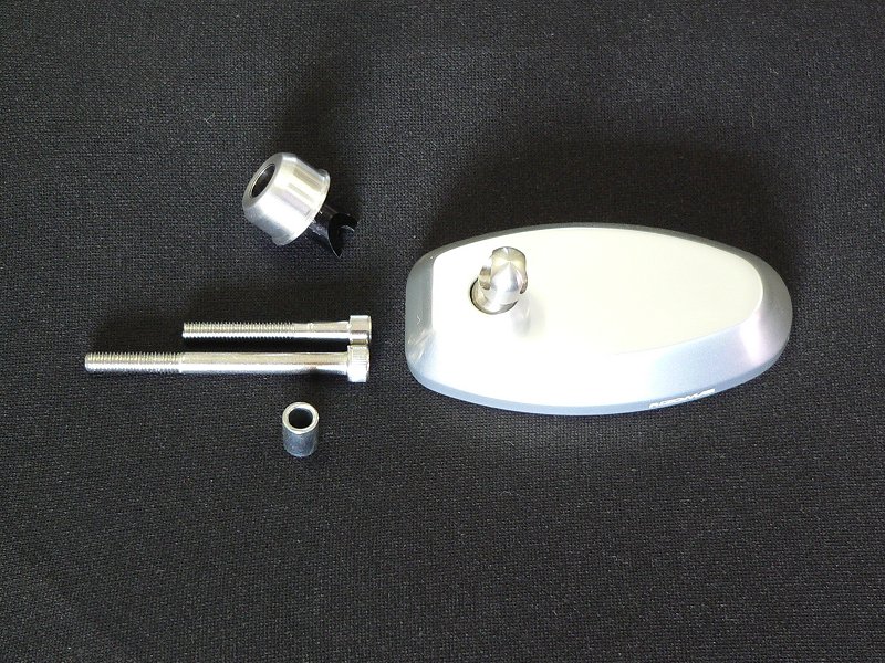 I modified a CRG bar end adapter to use as a mounting system for the Rizoma mirror in conjunction with a 3/8" OD, 1/4" ID, 1/2" long spacer and a 25mm longer bolt than what the CRG adapter kit comes with.